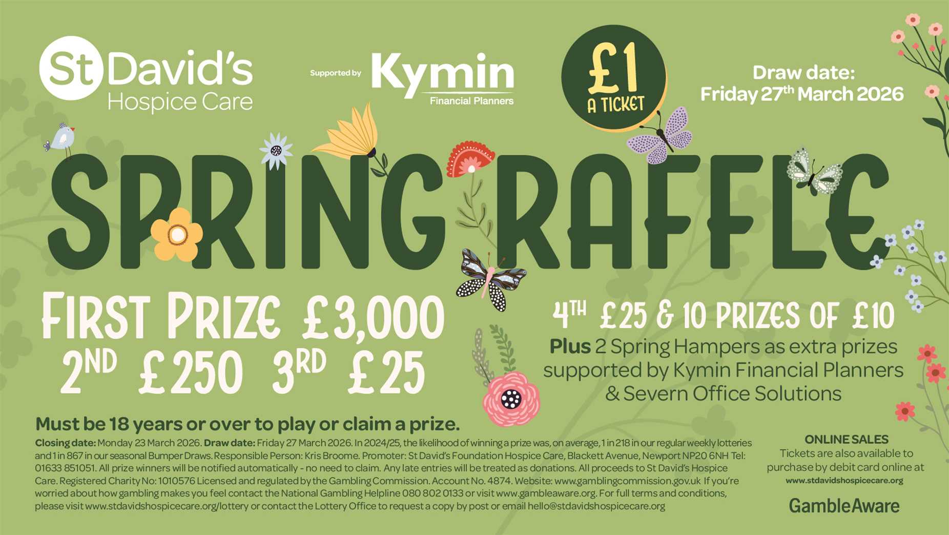 For full terms and conditions, please visit our website or contact the Lottery Office to request a copy by post or email hello@stdavidshospicecare.org.