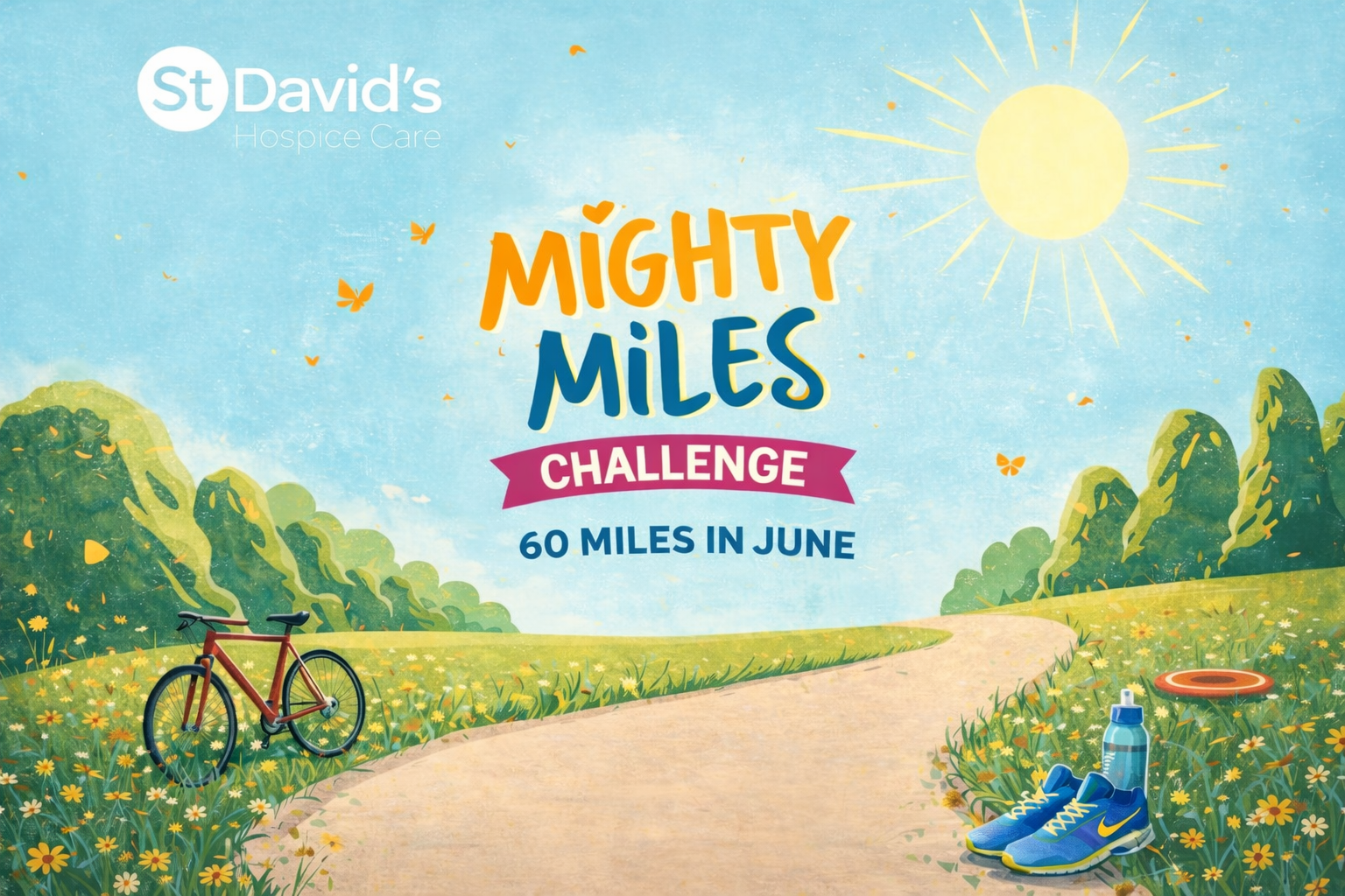 Sign up to the Mighty Miles Challenge this June! Complete a mile or two, whenever it suits you, in June and raise sponsorship for your local hospice (Don't worry if you miss a day, simply add on to another!) just complete a total of 60 miles throughout the month - your way! Every mile you move supports the work of St David's Hospice Care, simply commit to your goal and get sponsorship from those around you. 👉 What you'll receive: